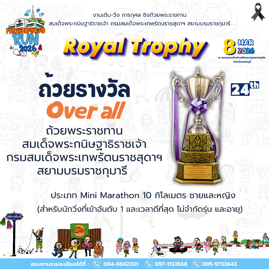 - ผู้ที่ทำเวลาดีที่สุด Over All ทั้งชาย/หญิง รับถ้วยรางวัลพระราชทานสมเด็จพระกนิษฐาธิราชเจ้า กรมสมเด็จพระเทพรัตนราชสุดา เจ้าฟ้ามหาจักรีสิรินธรฯ สยามบรมราชกุมารี