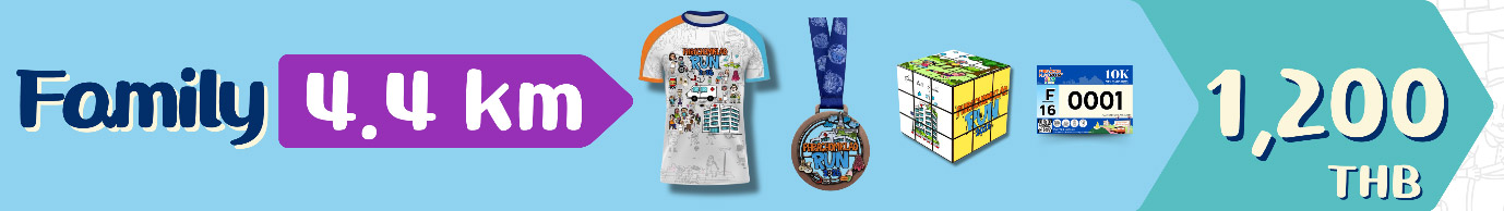 - ค่าสมัคร : 4.4 กิโลเมตร ค่าสมัคร 1,200 บาท (สมัครเป็นครอบครัวละ 3 คน โดยมีความสัมพันธ์ ดังนี้ พ่อ-แม่-ลูก, พ่อ-ลูก-ลูก, แม่-ลูก-ลูก, ไม่แบ่งประเภทและรุ่น)