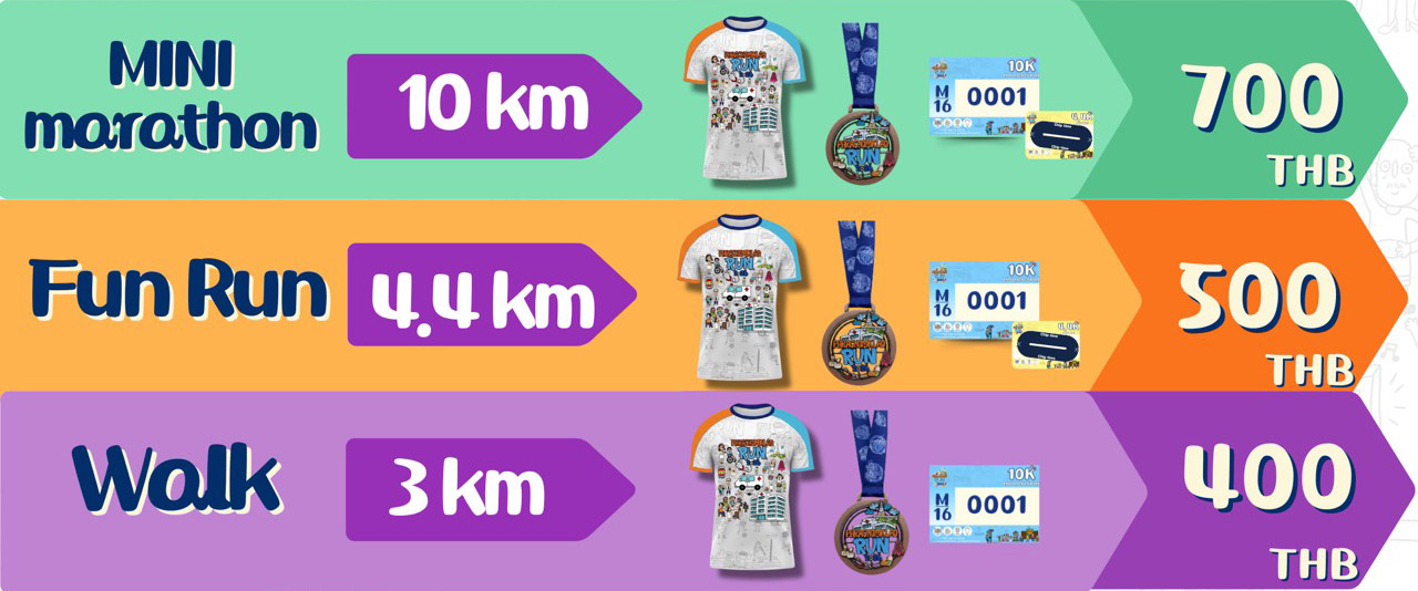 - ค่าสมัคร : 10.5 กิโลเมตร ค่าสมัคร 700 บาท, 4.4 กิโลเมตร ค่าสมัคร 500 บาท, และ 3 กิโลเมตร 400 บาท